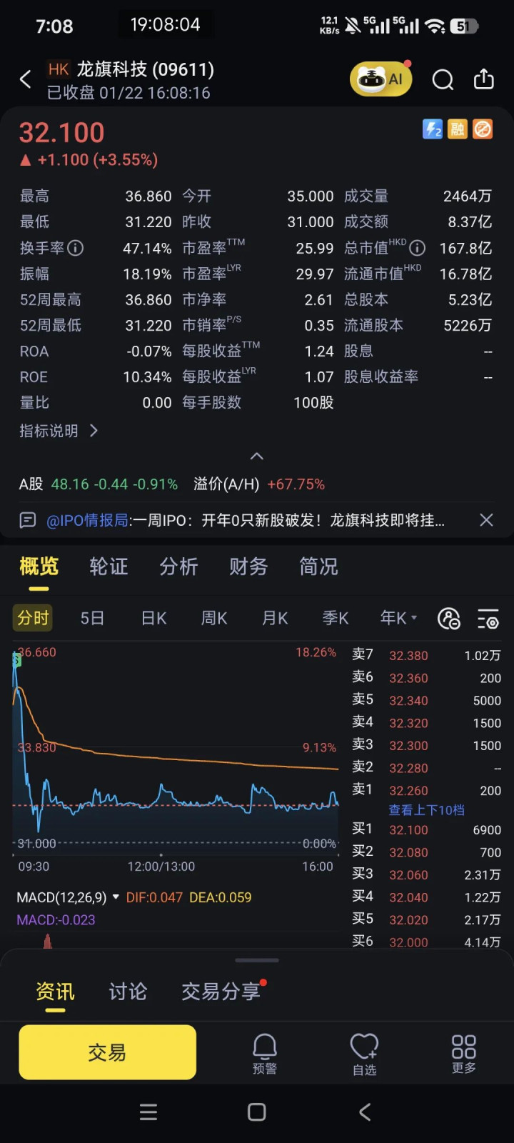 還好開(kāi)盤(pán)之后也走了。現(xiàn)在回過(guò)頭來(lái)看,慶幸,幸好暗盤(pán)走了一大半,競(jìng)價(jià)走了一大半,開(kāi)盤(pán)走完了幾乎全部。這時(shí)候就是慶幸,而不是后悔了。其首日股價(jià)呈現(xiàn)“高開(kāi)高走后回落”的走勢(shì),最終收盤(pán)報(bào)32.1港元,較31港元的發(fā)行價(jià)上漲3.55%,總市值約167.75億港元。